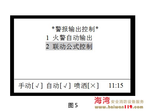 “警報(bào)輸出控制”是指對(duì)控制器的警報(bào)輸出接口進(jìn)行設(shè)置,可以設(shè)置為火警自動(dòng)輸出及聯(lián)動(dòng)公式控制方式。